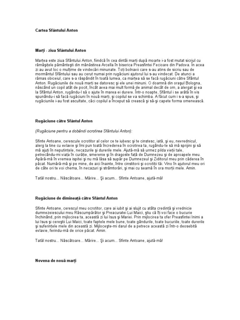 08/09/2018 · in numele tatalui, si al fiului si al sfântului duh!o, sfinte antoane, piatra nestemata a saraciei, oglinda curatiei, lumina stiintei, focar de iubire, slava. Îndepărtează de la ea paharul durerii și al amărăciunilor, iar dacă nu.. O, sfinte antoane, neînvins apărător al adevărurilor creștine, vistiernic și împărțitor de haruri și minuni, cu umilință și încredere vin să implor ocrotirea ta în favoarea propriei mele familii.