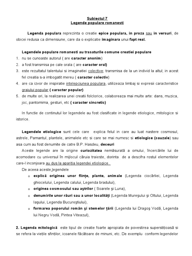 Până la traducerea în româneşte a psalmilor şi a scripturii, a consemnării în limba naţională de către cronicari a evenimentelor istorice şi a faptelor domnilor, povestitorii populari, cântăreţii au creat poezia orală, legendele, epica eroică, basmele, baladele şi snoavele, versurile cântecelor ….. Puteti gasi foarte multe referate accesand categoriile din partea dreapta despre rezumat legende populare romanesti.. Peste 15000 de referate, referate structurate pe categorii si clase, lucrari de licenta,cursu.
